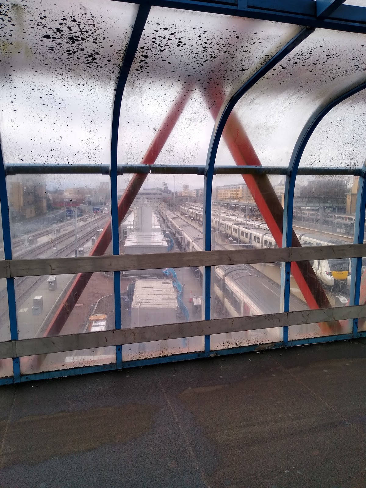 The view from the cycle bridge down the track to Mill Road Bridge, the next border point on my route, was as ever obscured by the moss and black mold that forms around about eye level on the perspex covering.